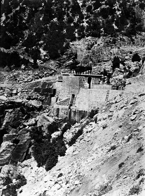| Contenido: La fotografía parece corresponder a la estructura de cemento armado situada en la parte superior del salto de agua donde finaliza el canal del Cinca, a la cual alude el ingeniero Juan Urrutia en informe de 31 de mayo de 1921: "Se hallan ya en obra todos los materiales para la construcción de la parte primera del cemento armado cuya construcción se va a comenzar inmediatamente". La fotografía debe de ser muy poco posterior a esta fecha. |