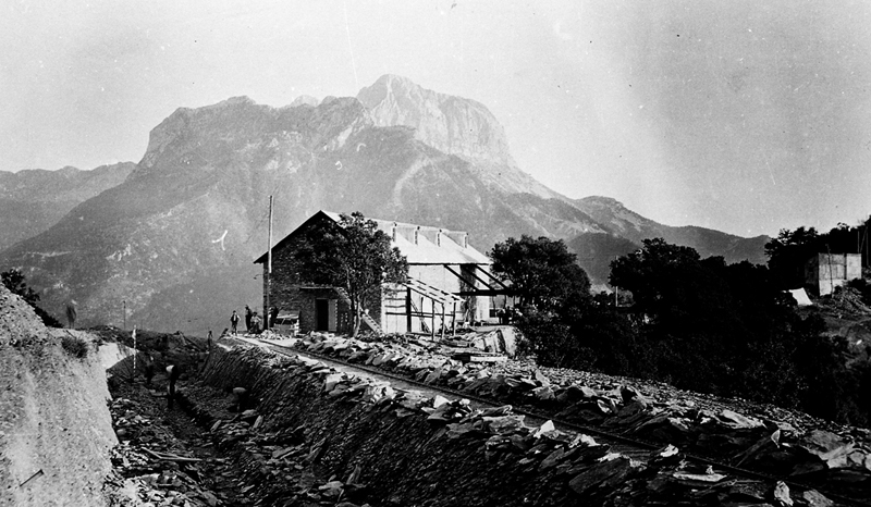 | Contenido: Obras de construcción del tramo final del canal del Cinca, inmediatamente sobre Lafortunada (con peña Solano y peña Montañesa al fondo) y en el punto antes de su enlace con las estructuras del salto de agua. |
