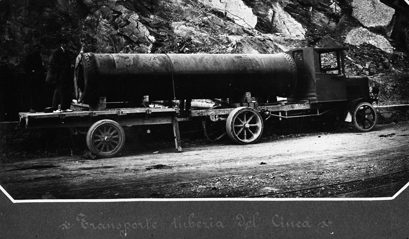 Nota: Procede de la misma imagen original que ES-ARA-MB-004-005-000-052, ES-ARA-MB-004-005-000-300 y ES-ARA-MB-004-005-000-465, fotografiada con distinta exposición. Título manuscrito acompañando la fotografía enmarcada. Existe otra copia, sin emarcar, de esta fotografía, en cuyo pie aparece un título diferente: "Tubería forzada. Transporte de un tubo Mannesmann". |