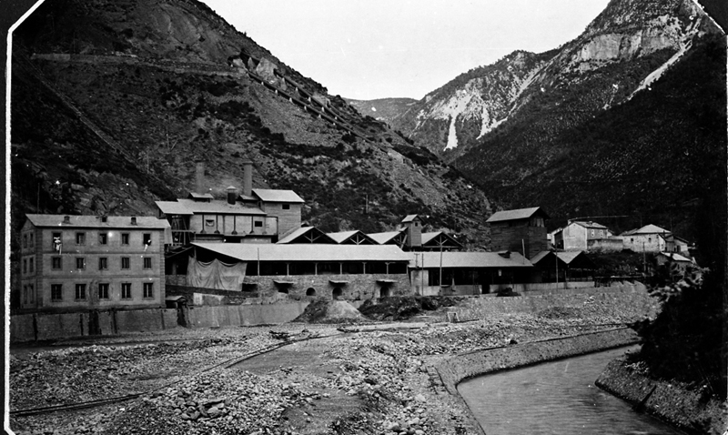 | Contenido: En primer plano, el canal de encauzamiento. Al fondo, al otro lado del Cinca, conjunto de edificios auxiliares entre los que destaca una construcción industrial que parece ser la fábrica de cemento portland construida por la Sociedad Hidroeléctrica Ibérica para abastecer las distintas obras del sistema del Cinca. |