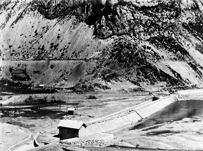 Contenido: La presa de Pineta recoge las aguas de los ríos Barrosa, Pinarra y Chisagües, y de los ibones de Marboré y Urdiceto. A través del canal del Cinca, de 14 kilómetros de longitud, la conduce hasta la central de Lafortunada. Se construyó en la primera fase de desarrollo del sistema hidroeléctrico del Cinca, que entró en funcionamiento a finales de 1922. \r\nEn la fotografía puede verse la presa construida, lo que permite fechar la fotografía entre junio de 1921 (en que únicamente estaría realizado el terraplén para su instalación) y el momento de la puesta en marcha de la central. |