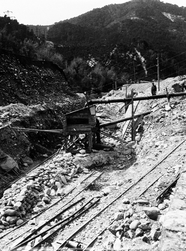 Contenido: Construcción del plano inclinado con raíles en la ladera para facilitar la subida de materiales a la obra. \r\nEn informe del ingeniero Juan Urrutia de 31 de mayo de 1921 se encuentra la siguiente referencia relacionada: "Con el objeto de facilitar las obras del depósito de extremidad y el montaje de la tubería se ha construido un plano inclinado del que solo falta la colocación de carriles que ya están facturados desde Barcelona y llegarán en pocos días al salto. Si como es de esperar Mannessmann cumple la promesa de entrega de la tubería y Altos Hornos no se retrasa en la entrega de la chapa de la parte que se va a construir en España, no veo dificultades que impidan que la expresada tubería pueda estar en funcionamiento para de hoy en un año". \r\nLa fotografía debió de tomarse en fecha muy poco posterior a la de este informe.\r\n |