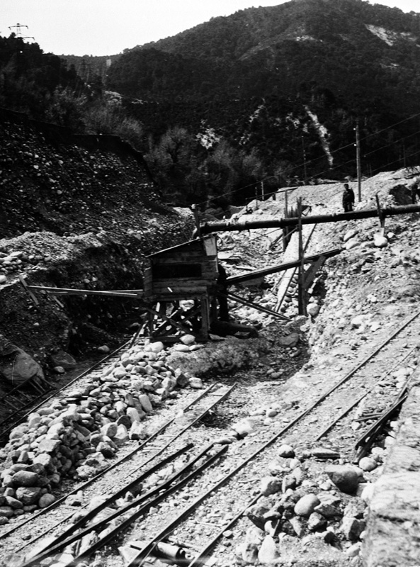 Contenido: Construcción del plano inclinado con raíles en la ladera para facilitar la subida de materiales a la obra.\r\nEn informe del ingeniero Juan Urrutia de 31 de mayo de 1921 se encuentra la siguiente referencia relacionada: "Con el objeto de facilitar las obras del depósito de extremidad y el montaje de la tubería se ha construido un plano inclinado del que solo falta la colocación de carriles que ya están facturados desde Barcelona y llegarán en pocos días al salto. Si como es de esperar Mannessmann cumple la promesa de entrega de la tubería y Altos Hornos no se retrasa en la entrega de la chapa de la parte que se va a construir en España, no veo dificultades que impidan que la expresada tubería pueda estar en funcionamiento para de hoy en un año". \r\nLa fotografía debió de tomarse en fecha muy poco posterior a la de este informe. \r\n\r\n |