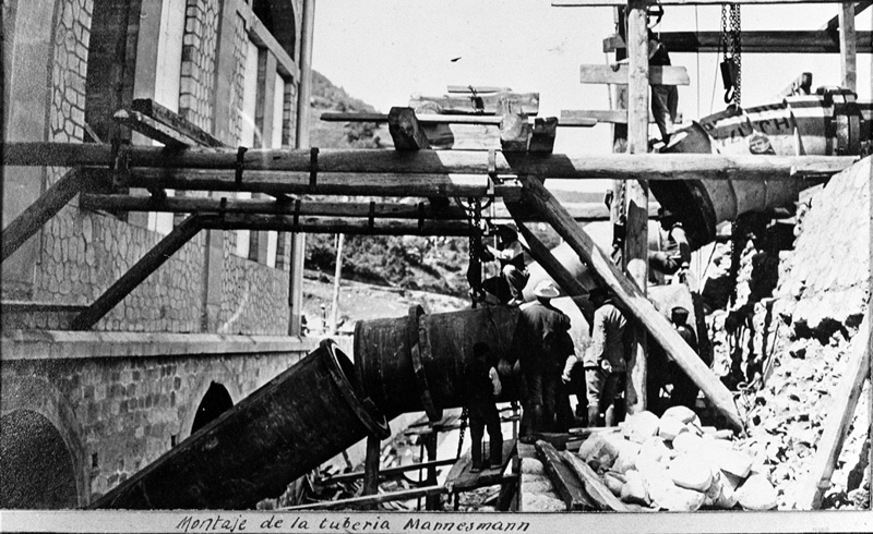 Contenido: Montaje del tramo final de la tubería del salto del Cinca, en su entrada en el edificio principal de la central de Lafortunada. Parece tratarse de un momento muy avanzado de las obras. \r\nLos tubos fueron construidos en Alemania por la empresa Mannessmannroehren-Werken en bloques de acero sin soldadura. Su traslado (en barco hasta Bilbao; de aquí, en tren a Barbastro; de allí a Lafortunada, en un trayecto de tres o cuatro días en tractores o camiones) fue muy costoso. |