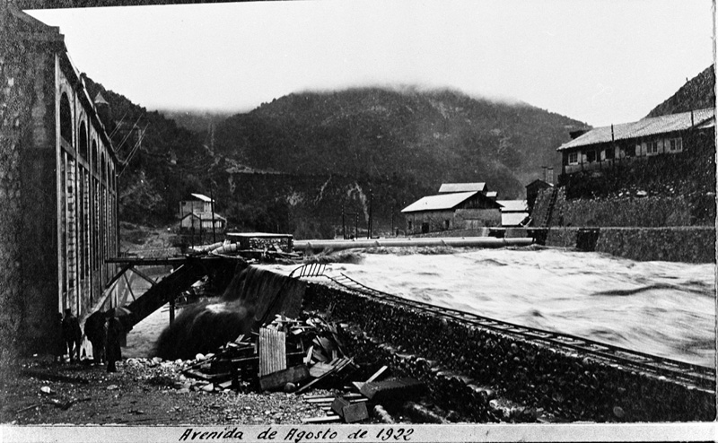 | Contenido: La crecida del río Cinca se produjo durante la fase final de construcción de la central de Lafortunada, ocasionando importantes daños a las obras. \r\n |