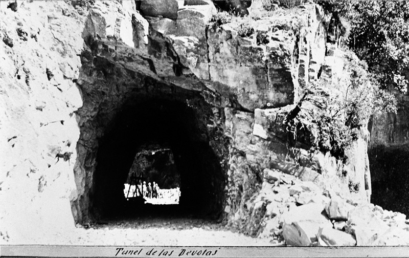 Contenido: Paralelamente a la construcción de las infraestructuras de la primera fase del sistema del Cinca, puesta en funcionamiento a finales de 1922, la sociedad hidroeléctrica realizó otras obras auxiliares (apertura de carreteras, instalación de líneas telefónicas), entre las que se encuentra la carretera de Lafortunada a Salinas y Bielsa, cuyo trazado coincide con el actual. La fotografía parece tomada durante el proceso de construcción del túnel y la carretera. |