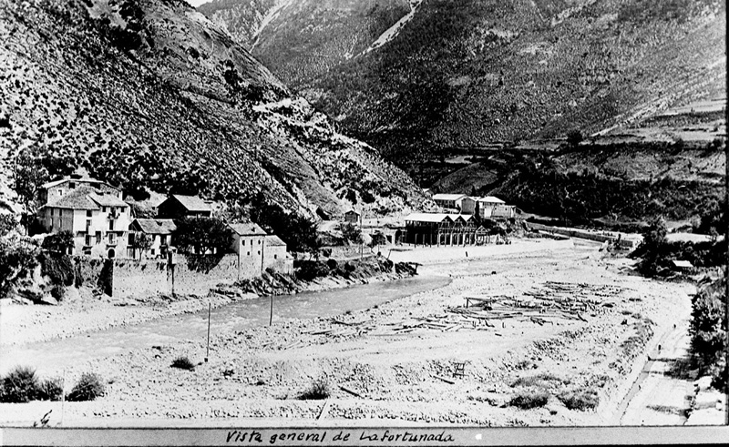 | Contenido: Fotografía tomada antes de la construcción de la central, pero cuando ya se habían levantado algunos edificios auxiliares y de alojamiento. En primer plano, las dos casas que hasta la fecha constituían la aldea de Lafortunada (casa Cuadrado y casa Tomás); al fondo, edificios de la Sociedad. \r\n |