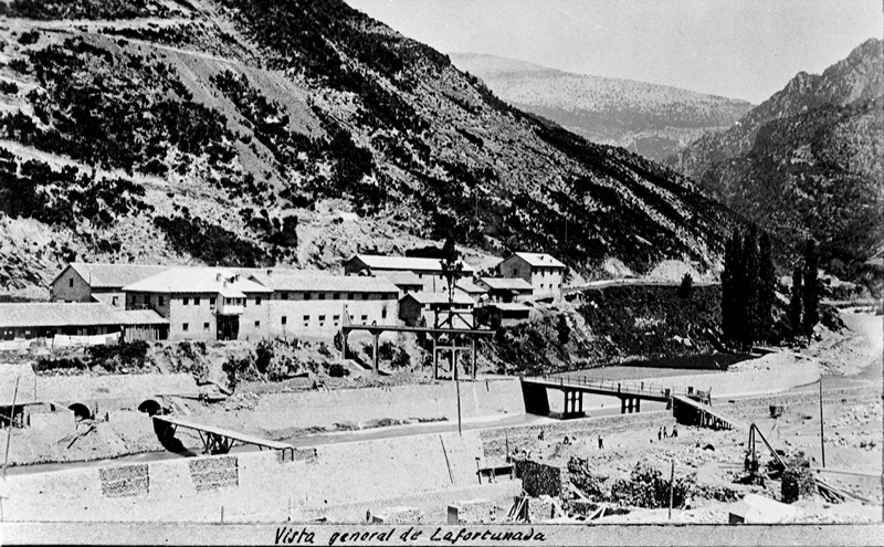 | Contenido: En primer plano, obras de construcción de la central en una fase muy inicial. Al fondo, al otro lado del río Cinca, edificios auxiliares y de alojamiento de la Sociedad. |