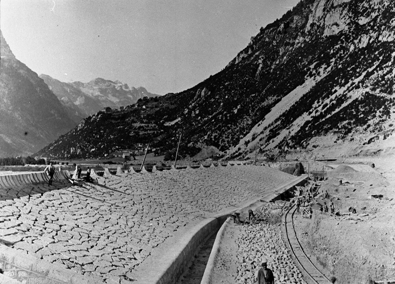 Contenido: La presa de Pineta recoge las aguas de los ríos Barrosa, Pinarra y Chisagües, y de los ibones de Marboré y Urdiceto. A través del canal del Cinca, de 14 kilómetros de longitud, la conduce hasta la central de Lafortunada. Se construyó en la primera fase de desarrollo del sistema hidroeléctrico del Cinca, que entró en funcionamiento a finales de 1922. \r\nLa fotografía puede fecharse entre junio de 1921 (en que únicamente estaría realizado el terraplén para su instalación) y el momento de la puesta en marcha de la central. \r\n |