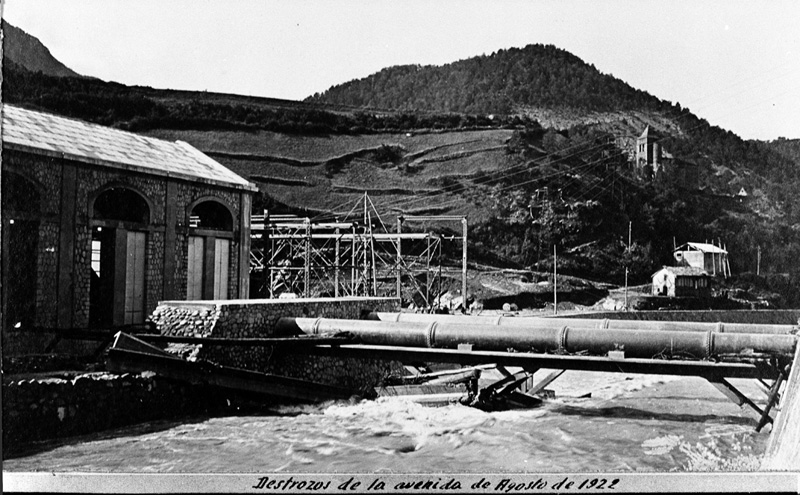 | Contenido: La crecida del río Cinca se produjo durante la fase final de construcción de la central de Lafortunada, ocasionando importantes daños a las obras. \r\n |