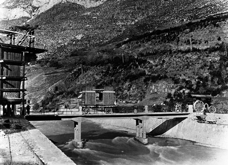 | Contenido: En la fotografía puede verse el puente sobre el Cinca y la estación de descarga del cable aéreo, que estuvo en funcionamiento durante la construcción de la primera fase de la central de Lafortunada. |