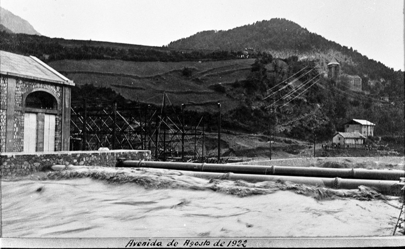 | Contenido: La crecida del río Cinca se produjo durante la fase final de construcción de la central de Lafortunada, ocasionando importantes daños a las obras.