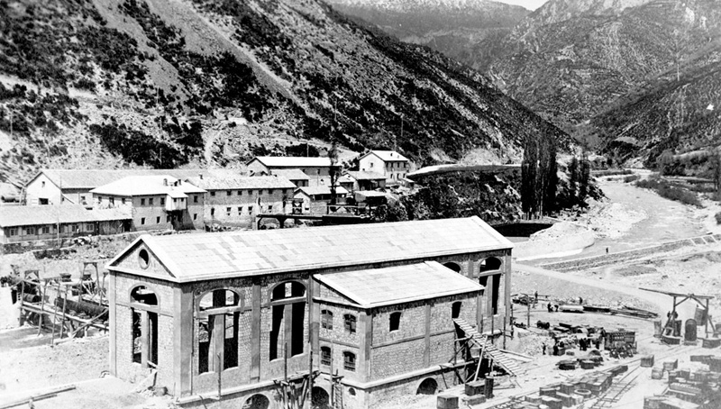 | Contenido: Al otro lado del edificio principal de la central puede verse el montaje del tramo final de la tubería del salto del Cinca sobre las pasarelas de hormigón cuya construcción aparece en otras fotografías de esta subsección. |