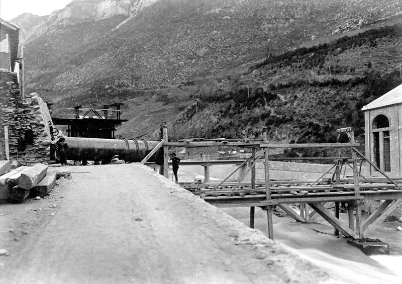 | Contenido: Montaje de los tubos del tramo final de la conducción del salto del Cinca sobre las pasarelas de hormigón armado que atraviesan el río hasta el edificio principal de la central. Cuando tuvo lugar la crecida de agosto de 1922 ya estaban montadas. |