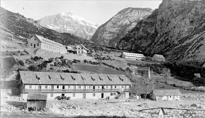 En la fotografía pueden verse dos edificios para el alojamiento de empleados, a continuación la casa de oficinas y, al fondo, el cuartel de la Guardia Civil y el hospital. |