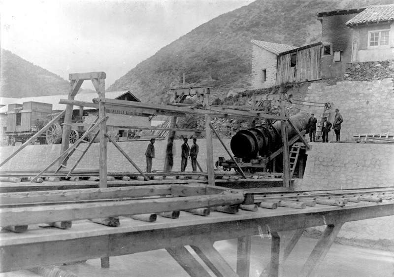 | Contenido: Montaje de los tubos del tramo final de la conducción del salto del Cinca sobre las pasarelas de hormigón armado que atraviesan el río hasta el edificio principal de la central. Cuando tuvo lugar la crecida de agosto de 1922 ya estaban montadas. |