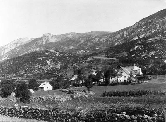 | Contenido: La expedición sale de Bielsa el día 29, pero una tormenta les obliga a detenerse unas horas en Javierre. \r\nLas siguientes palabras del relato de Briet están en relación con esta fotografía: "De esta guisa atravesamos Las Cortes, en la parte baja de Espierba. Las casas, con su cercados plantados de árboles, se alzaban desperdigadas a la manera rústica. No dudaba ya de que llegaríamos sin incidente alguno a la ermita donde pensábamos instalarnos...". Lucien Briet. Un viaje a Bielsa en 1902, p. 19, traducido por Julio Brioso de BRIET, Lucien, "Par-delà La Munia", Bulletin du Club Alpin Français, Section du Sud-Ouest, 1902. |