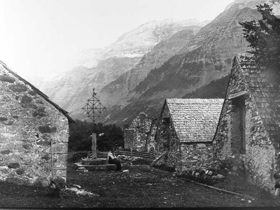 Contenido: Con esta fotografía esá relacionado el siguiente texto del mismo autor:\r\n"Algunos pasos más allá, llegamos a un claro y aparece ante nuestros ojos el oratorio de Nuestra Señora de Pineta, con los pobres edificios que le hacen compañía. \r\nA través de un campo yermo, sembrado de menudas piedrecillas nos dirigimos hacia la ermita. Pasamos junto a las ruinas del antiguo hospital, palabra que ha de entenderse aquí en el sentido de asilo. No quedaban de él sino las cuatro paredes. Después, dejando a la izquierda dos bordas cerradas, llegamos a un calvario semejante al que se eleva en el transcurso de las misiones; había allí como una encrucijada. Algunos metros todavía, y penetramos en el santuario." \r\nLucien Briet. Un viaje a Bielsa en 1902, p. 19, traducido por Julio Brioso de BRIET, Lucien, "Par-delà La Munia", Bulletin du Club Alpin Français, Section du Sud-Ouest, 1902. \r\n |