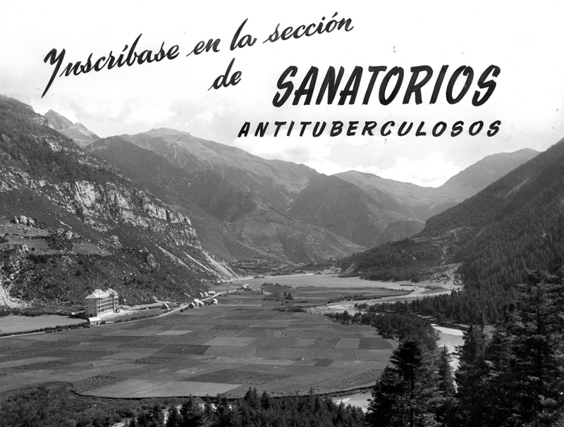 | Contenido: Sobre la imagen aparece impresa la frase "Inscríbase en la sección de SANATORIOS ANTITUBERCULOSOS". Parece tratarse de la portada de un folleto o de un desplegable con imágenes del sanatorio. |