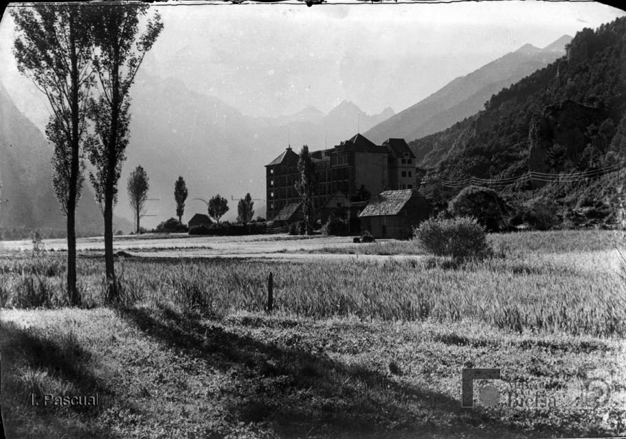 | Contenido: Sanatorio de Pineta. La sociedad Sanatorios del Pirineo Aragonés construye el sanatorio de Pineta en la década de 1930 como hospital para tuberculosos. Terminado en 1936, la guerra civil impidió su inauguración y la 43 DV del Ejército Republicano lo utiliza como hospital durante la bolsa de Bielsa. La Quinta de Salud la Alianza, mutua de seguros catalana, compra el edificio en 1949, lo reconstruye y lo equipa pero no llega a funcionar como hospital de tuberculosos al descender la curva de la enfermedad en los años 50. A partir de los años 60 es utilizado como edificio turístico y recreativo. |