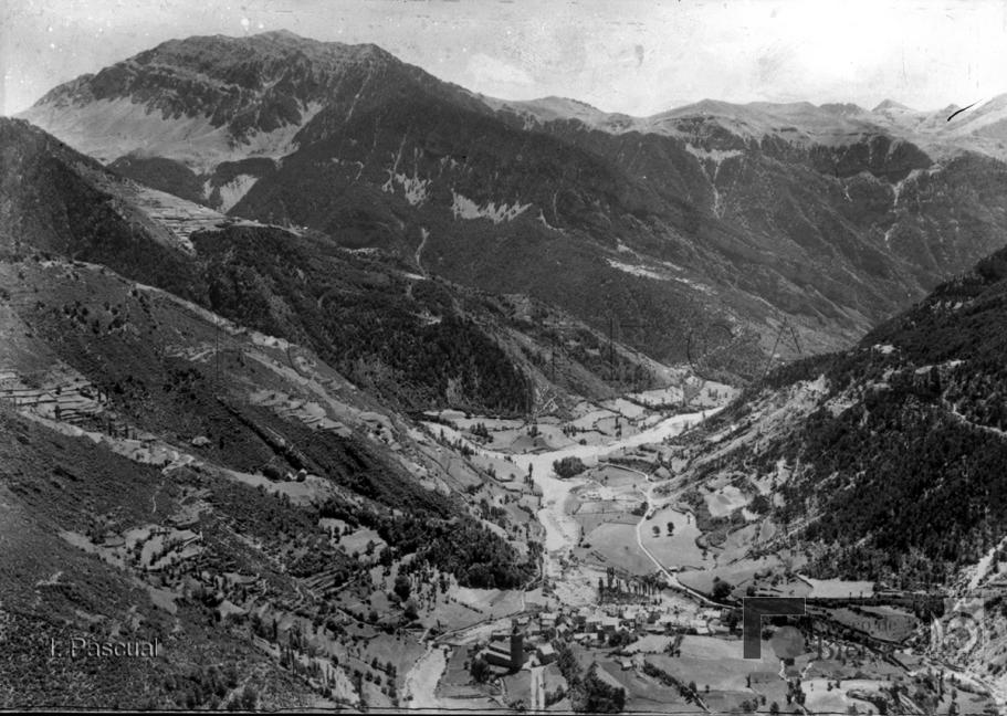 | Contenido: Desde que conoció Bielsa a principios de la década de 1940, Ismael Pascual realiza fotografías de Bielsa y del valle donde se reflejan los cambios producidos por la reconstrucción del pueblo tras la guerra y por las obras hidráulicas en la cabecera del río Cinca. En esta imagen vista panorámica de Bielsa en primer plano y del valle del río Cinca hacia el sur. |