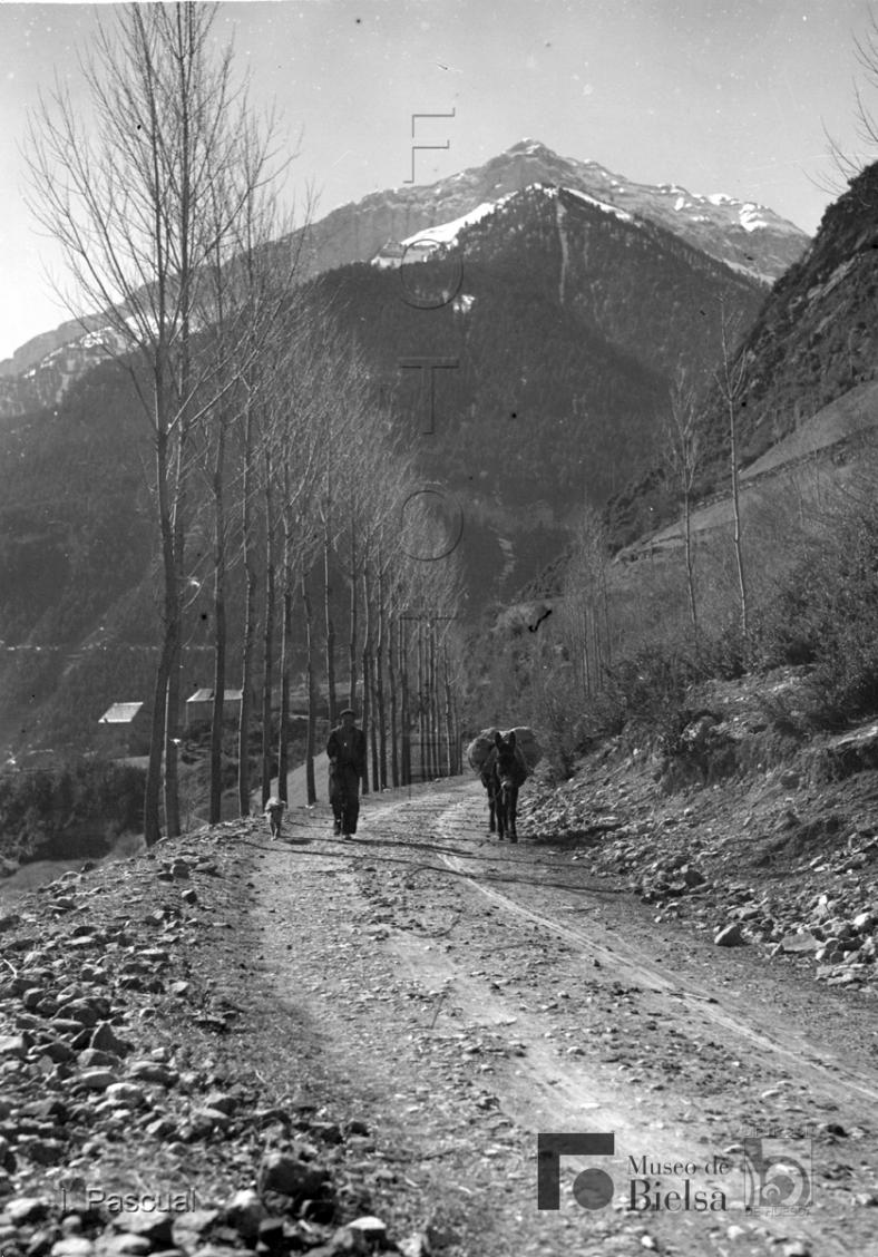 | Contenido: Imágenes de Bielsa y del valle. Desde que conoció Bielsa a principios de la década de 1940, Ismael Pascual realiza fotografías de Bielsa y del valle donde se reflejan los cambios producidos por la reconstrucción del pueblo tras la guerra y por las obras hidráulicas en la cabecera del río Cinca. También realiza muchas salidas de alta montaña con un guía y en ocasiones con amigos y familiares. En esta imagen la carretera de acceso a Pineta está todavía sin asfaltar. |
