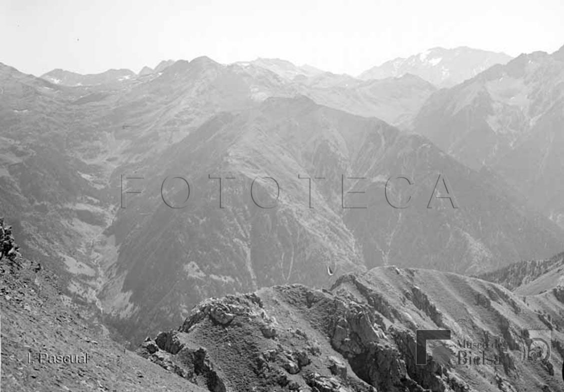 | Contenido: Imágenes de Bielsa y del valle. Desde que conoció Bielsa a principios de la década de 1940, Ismael Pascual realiza fotografías de Bielsa y del valle donde se reflejan los cambios producidos por la reconstrucción del pueblo tras la guerra y por las obras hidráulicas en la cabecera del río Cinca. También realiza muchas salidas de alta montaña con un guía y en ocasiones con amigos y familiares. En esta imagen el valle de Trigoniero, afluente del río Barrosa, tomada desde el monte Liena, cerca de la frontera con Francia. |