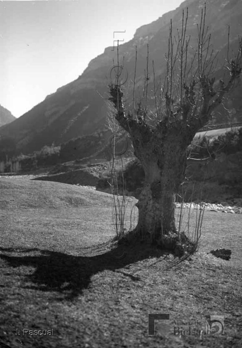 | Contenido: Imágenes de Bielsa y del valle. Desde que conoció Bielsa a principios de la década de 1940, Ismael Pascual realiza fotografías de Bielsa y del valle donde se reflejan los cambios producidos por la reconstrucción del pueblo tras la guerra y por las obras hidráulicas en la cabecera del río Cinca. También realiza muchas salidas de alta montaña con un guía y en ocasiones con amigos y familiares. Imagen de paisaje a la entrada de Bielsa. |