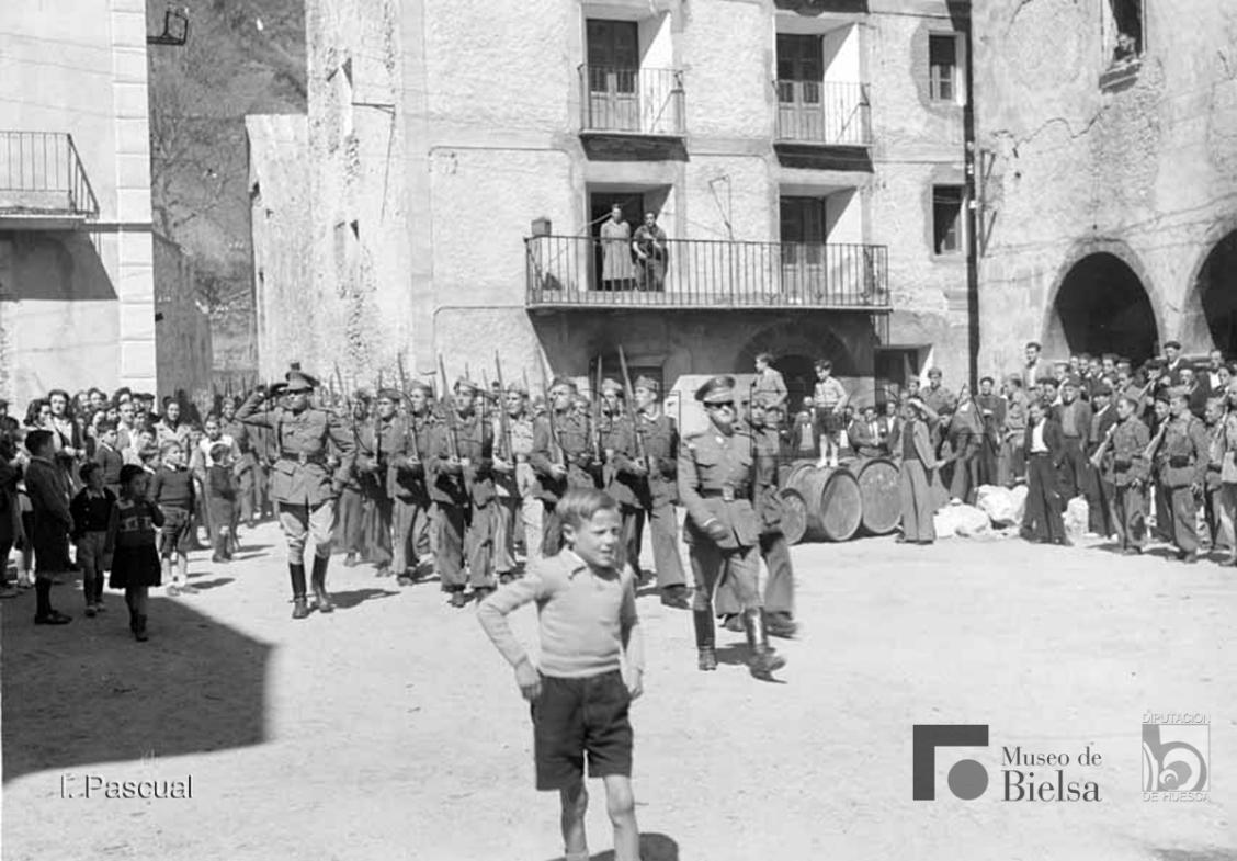 | Contenido: Imágenes de Bielsa y del valle. Desde que conoció Bielsa a principios de la década de 1940, Ismael Pascual realiza fotografías de Bielsa y del valle donde se reflejan los cambios producidos por la reconstrucción del pueblo tras la guerra y por las obras hidráulicas en la cabecera del río Cinca. También realiza muchas salidas de alta montaña con un guía y en ocasiones con amigos y familiares. Imagen del desfile del ejército nacional en la plaza de Bielsa en los años 40. |