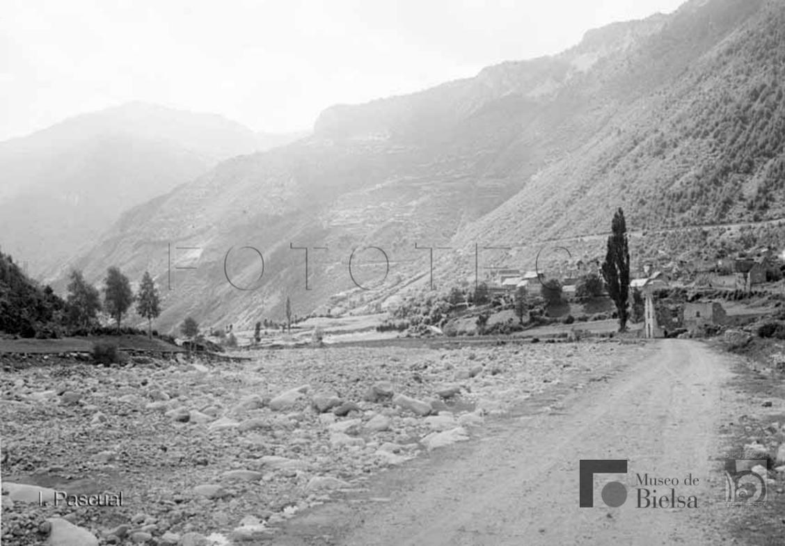 | Contenido: Imágenes de Bielsa y del valle. Desde que conoció Bielsa a principios de la década de 1940, Ismael Pascual realiza fotografías de Bielsa y del valle donde se reflejan los cambios producidos por la reconstrucción del pueblo tras la guerra y por las obras hidráulicas en la cabecera del río Cinca. También realiza muchas salidas de alta montaña con un guía y en ocasiones con amigos y familiares. Parzán desde la carretera que accedía a la central del río Barrosa. Como Bielsa, en la década de los 40 está en plena reconstrucción. |