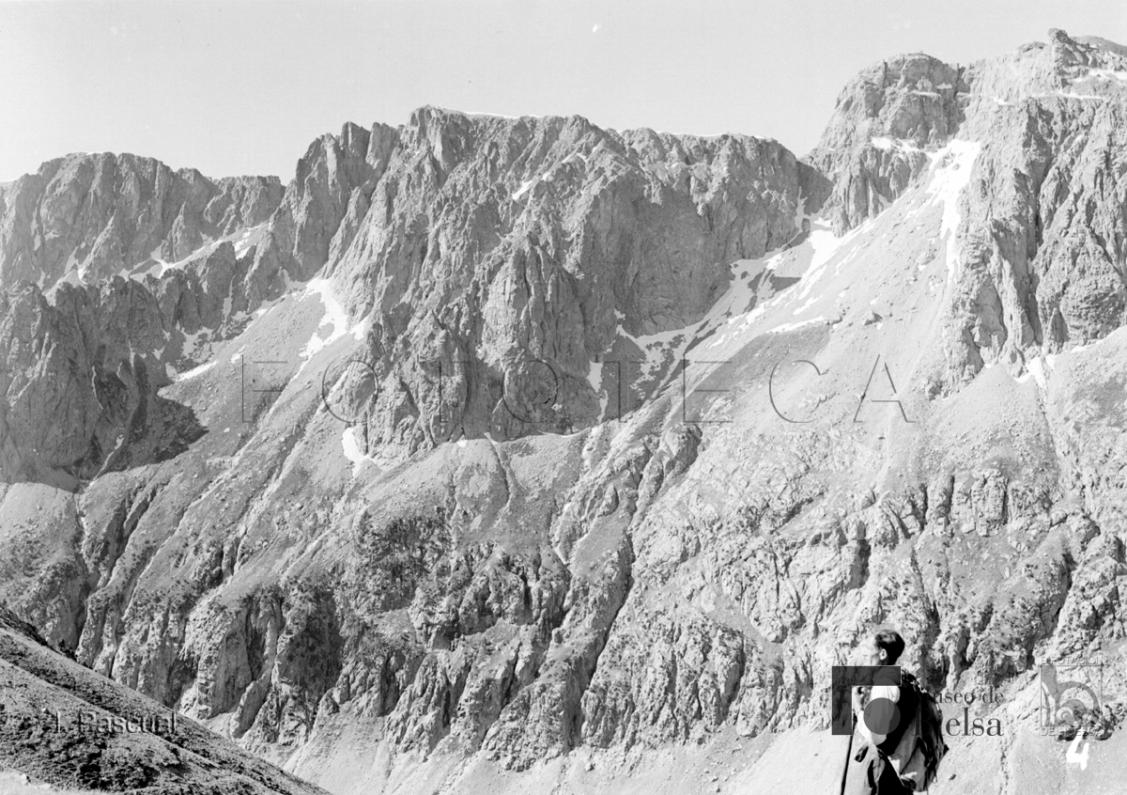 Contenido: Imágenes de Bielsa y del valle. Desde que conoció Bielsa a principios de la década de 1940, Ismael Pascual realiza fotografías de Bielsa y del valle donde se reflejan los cambios producidos por la reconstrucción del pueblo tras la guerra y por las obras hidráulicas en la cabecera del río Cinca. También realiza muchas salidas de alta montaña con un guía y en ocasiones con amigos y familiares. Posiblemente imagen tomada en la misma salida que la anterior, en primer plano el guía Antonio Noguero de casa Pichón de Bielsa. |
