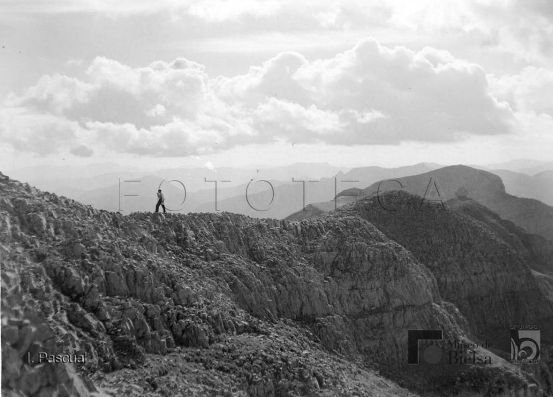 Contenido: Imágenes de Bielsa y del valle. Desde que conoció Bielsa a principios de la década de 1940, Ismael Pascual realiza fotografías de Bielsa y del valle donde se reflejan los cambios producidos por la reconstrucción del pueblo tras la guerra y por las obras hidráulicas en la cabecera del río Cinca. También realiza muchas salidas de alta montaña con un guía y en ocasiones con amigos y familiares. Vista panorámica de Montinier, en el 1º plano el guía de Ismael Pascual, Antonio Noguero de Casa Pichón, al fondo en el 2º plano los Sestrales. |