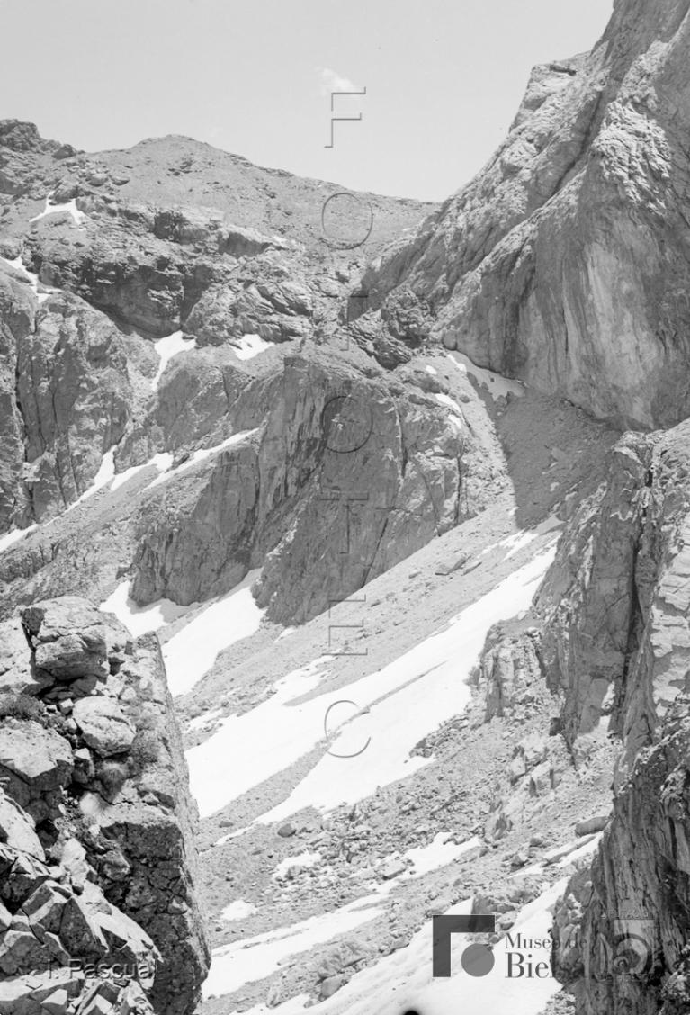 Contenido: Imágenes de Bielsa y del valle. Desde que conoció Bielsa a principios de la década de 1940, Ismael Pascual realiza fotografías de Bielsa y del valle donde se reflejan los cambios producidos por la reconstrucción del pueblo tras la guerra y por las obras hidráulicas en la cabecera del río Cinca. También realiza muchas salidas de alta montaña con un guía y en ocasiones con amigos y familiares. Nota del autor a la imagen: ‘Bielsa - Desfiladero del camino de las Pardas (paso que une a las montañas de Liena con la frontera de Barroseta) paso secreto y difícil de vigilar’. |
