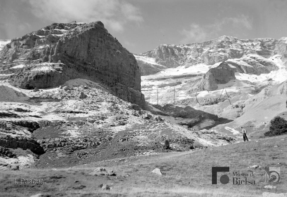 Contenido: Imágenes de Bielsa y del valle. Desde que conoció Bielsa a principios de la década de 1940, Ismael Pascual realiza fotografías de Bielsa y del valle donde se reflejan los cambios producidos por la reconstrucción del pueblo tras la guerra y por las obras hidráulicas en la cabecera del río Cinca. También realiza muchas salidas de alta montaña con un guía y en ocasiones con amigos y familiares. Nota del autor a la imagen: ‘Bielsa, subiendo a Montinier desde el Sanatorio’. |