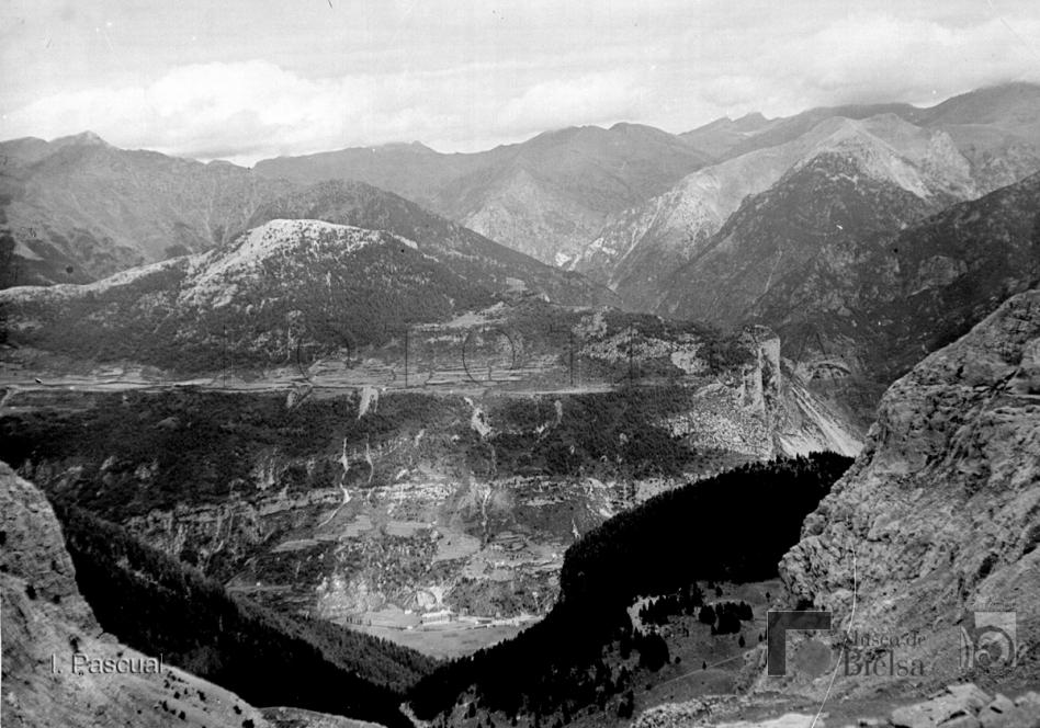 Contenido: Imágenes de Bielsa y del valle. Desde que conoció Bielsa a principios de la década de 1940, Ismael Pascual realiza fotografías de Bielsa y del valle donde se reflejan los cambios producidos por la reconstrucción del pueblo tras la guerra y por las obras hidráulicas en la cabecera del río Cinca. También realiza muchas salidas de alta montaña con un guía y en ocasiones con amigos y familiares. Panorámica de monte Cuezo desde Montinier, en la parte inferior de la imagen el sanatorio de Pineta. |