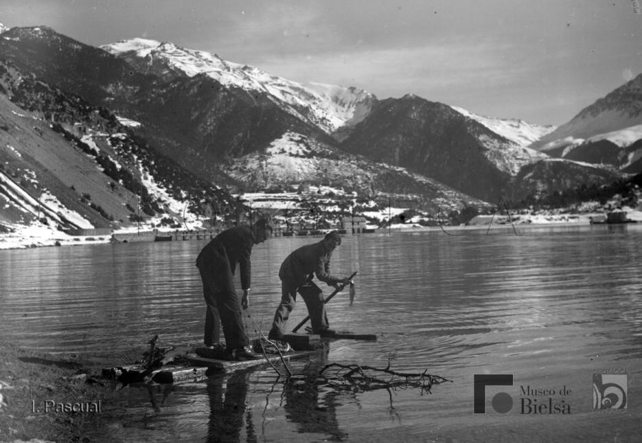 Contenido: Imágenes de Bielsa y del valle. Desde que conoció Bielsa a principios de la década de 1940, Ismael Pascual realiza fotografías de Bielsa y del valle donde se reflejan los cambios producidos por la reconstrucción del pueblo tras la guerra y por las obras hidráulicas en la cabecera del río Cinca. También realiza muchas salidas de alta montaña con un guía y en ocasiones con amigos y familiares. Pescando en la presa de Pineta, Manuel Lamula compañero de trabajo de Ismael Pascual y Méliz de Bielsa. |