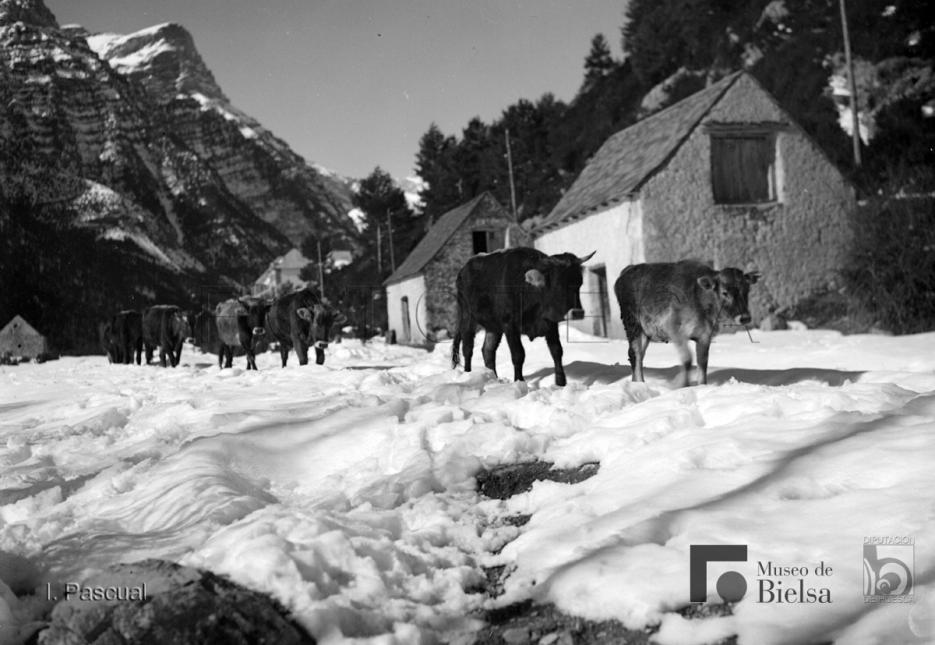 Contenido: Imágenes de Bielsa y del valle. Desde que conoció Bielsa a principios de la década de 1940, Ismael Pascual realiza fotografías de Bielsa y del valle donde se reflejan los cambios producidos por la reconstrucción del pueblo tras la guerra y por las obras hidráulicas en la cabecera del río Cinca. También realiza muchas salidas de alta montaña con un guía y en ocasiones con amigos y familiares. Rebaño de vacas en Pineta cerca de la presa. |