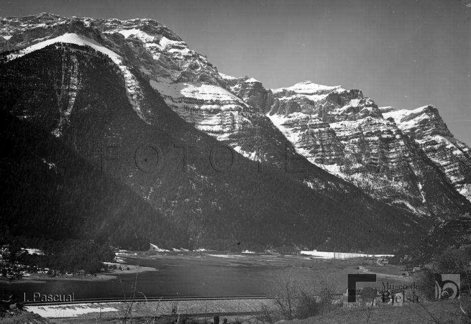 Contenido: Imágenes de Bielsa y del valle. Desde que conoció Bielsa a principios de la década de 1940, Ismael Pascual realiza fotografías de Bielsa y del valle donde se reflejan los cambios producidos por la reconstrucción del pueblo tras la guerra y por las obras hidráulicas en la cabecera del río Cinca. También realiza muchas salidas de alta montaña con un guía y en ocasiones con amigos y familiares. Valle de Pineta, en primer plano la presa sobre el río Cinca que canaliza el agua para uno de los saltos de la central eléctrica de Lafortunada. De frente la Sierra de las Tucas. |