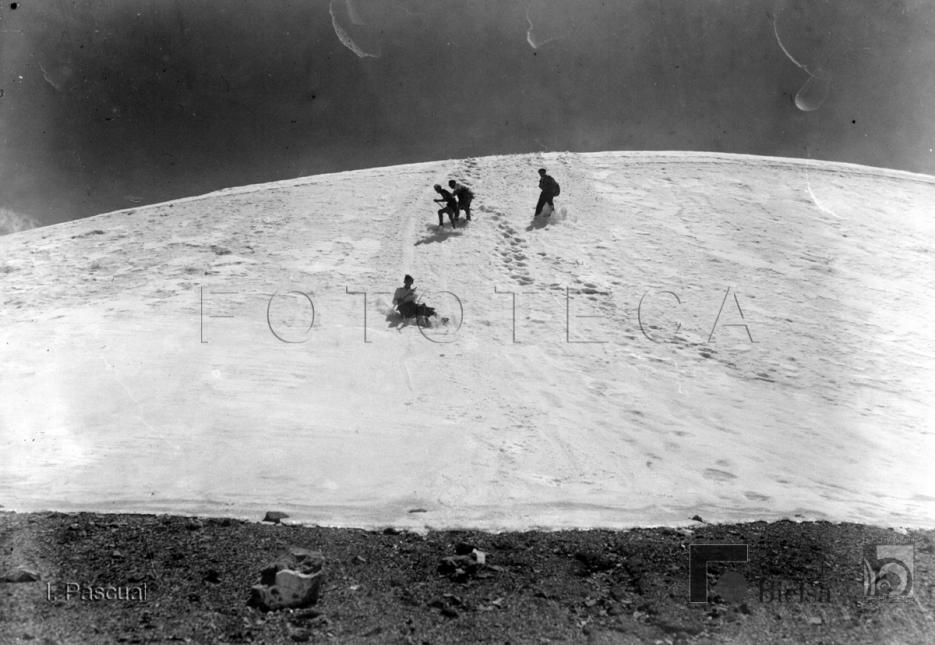 Contenido: Imágenes de Bielsa y del valle. Desde que conoció Bielsa a principios de la década de 1940, Ismael Pascual realiza fotografías de Bielsa y del valle donde se reflejan los cambios producidos por la reconstrucción del pueblo tras la guerra y por las obras hidráulicas en la cabecera del río Cinca. También realiza muchas salidas de alta montaña con un guía y en ocasiones con amigos y familiares. Ismael Pascual, el guía Antonio Noguero de casa Pichón de Bielsa y grupos de amigos hacen abundantes salidas a la alta montaña del entorno. En esta imagen en el glaciar de Monte Perdido. |