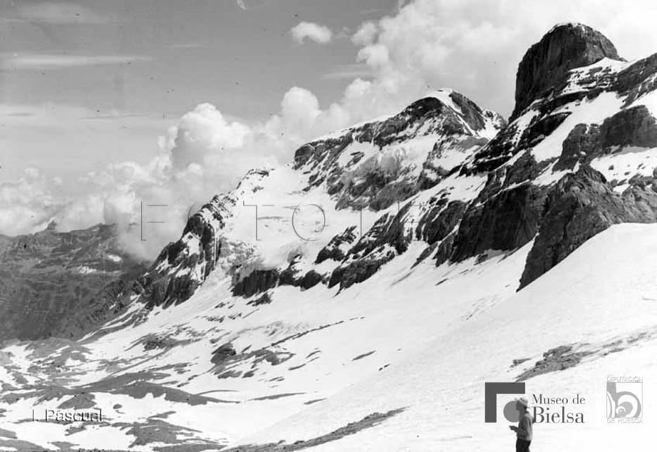 Contenido: Imágenes de Bielsa y del valle. Desde que conoció Bielsa a principios de la década de 1940, Ismael Pascual realiza fotografías de Bielsa y del valle donde se reflejan los cambios producidos por la reconstrucción del pueblo tras la guerra y por las obras hidráulicas en la cabecera del río Cinca. También realiza muchas salidas de alta montaña con un guía y en ocasiones con amigos y familiares. Ismael Pascual, el guía Antonio Noguero de casa Pichón de Bielsa y grupos de amigos hacen abundantes salidas a la alta montaña del entorno. Imagen del Cilindro, la cima y el glacial de Monte Perdido desde Marboré. |