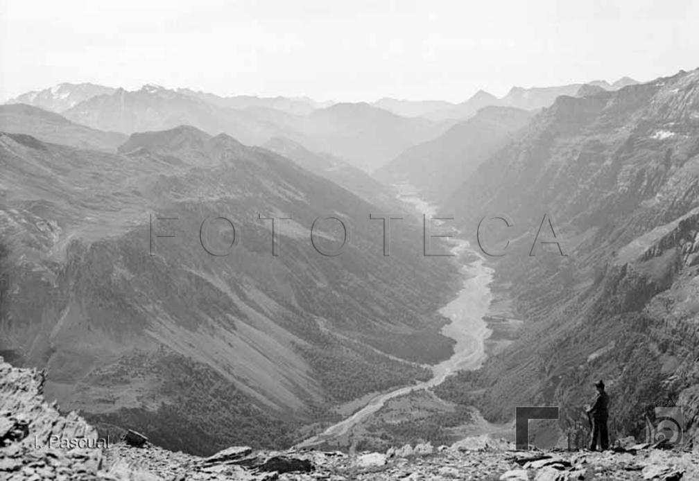Contenido: Imágenes de Bielsa y del valle. Desde que conoció Bielsa a principios de la década de 1940, Ismael Pascual realiza fotografías de Bielsa y del valle donde se reflejan los cambios producidos por la reconstrucción del pueblo tras la guerra y por las obras hidráulicas en la cabecera del río Cinca. También realiza muchas salidas de alta montaña con un guía y en ocasiones con amigos y familiares. Ismael Pascual con el guía Antonio Noguero de casa Pichón de Bielsa y en ocasiones con amigos, hacen abundantes salidas a la alta montaña del entorno. Panorámica del Valle de Pineta desde la subida a lago Marberé, nota del autor: ‘Valle de Pineta desde la pared del lago de Marboré’. |