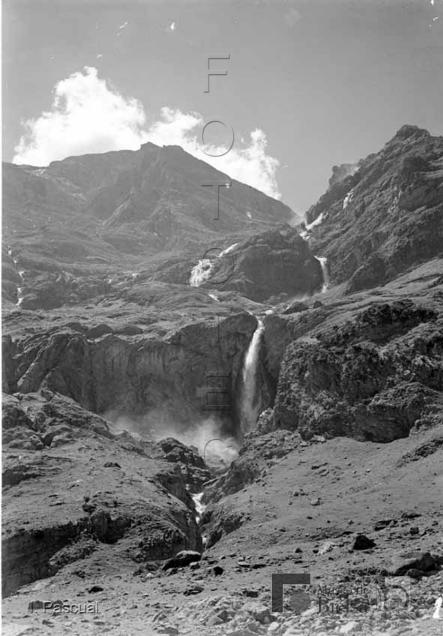 Contenido: Imágenes de Bielsa y del valle. Desde que conoció Bielsa a principios de la década de 1940, Ismael Pascual realiza fotografías de Bielsa y del valle donde se reflejan los cambios producidos por la reconstrucción del pueblo tras la guerra y por las obras hidráulicas en la cabecera del río Cinca. También realiza muchas salidas de alta montaña con un guía y en ocasiones con amigos y familiares. En el circo de Pineta, cascadas que desaguan desde Marboré y que dan nacimiento al río Cinca. |