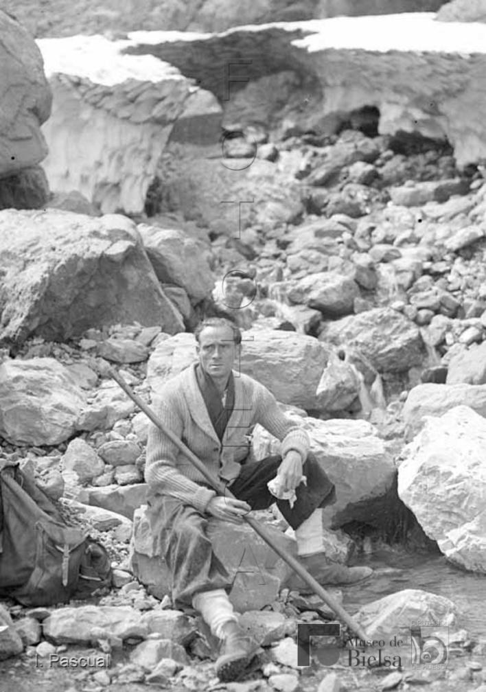 Contenido: Imágenes de Bielsa y del valle. Desde que conoció Bielsa a principios de la década de 1940, Ismael Pascual realiza fotografías de Bielsa y del valle donde se reflejan los cambios producidos por la reconstrucción del pueblo tras la guerra y por las obras hidráulicas en la cabecera del río Cinca. También realiza muchas salidas de alta montaña con un guía y en ocasiones con amigos y familiares. Ismael Pascual con el guía Antonio Noguero de casa Pichón de Bielsa y en ocasiones con amigos, hacen abundantes salidas a la alta montaña del entorno. El autor se autorretrata en la subida a Marboré bajo un nevero. |