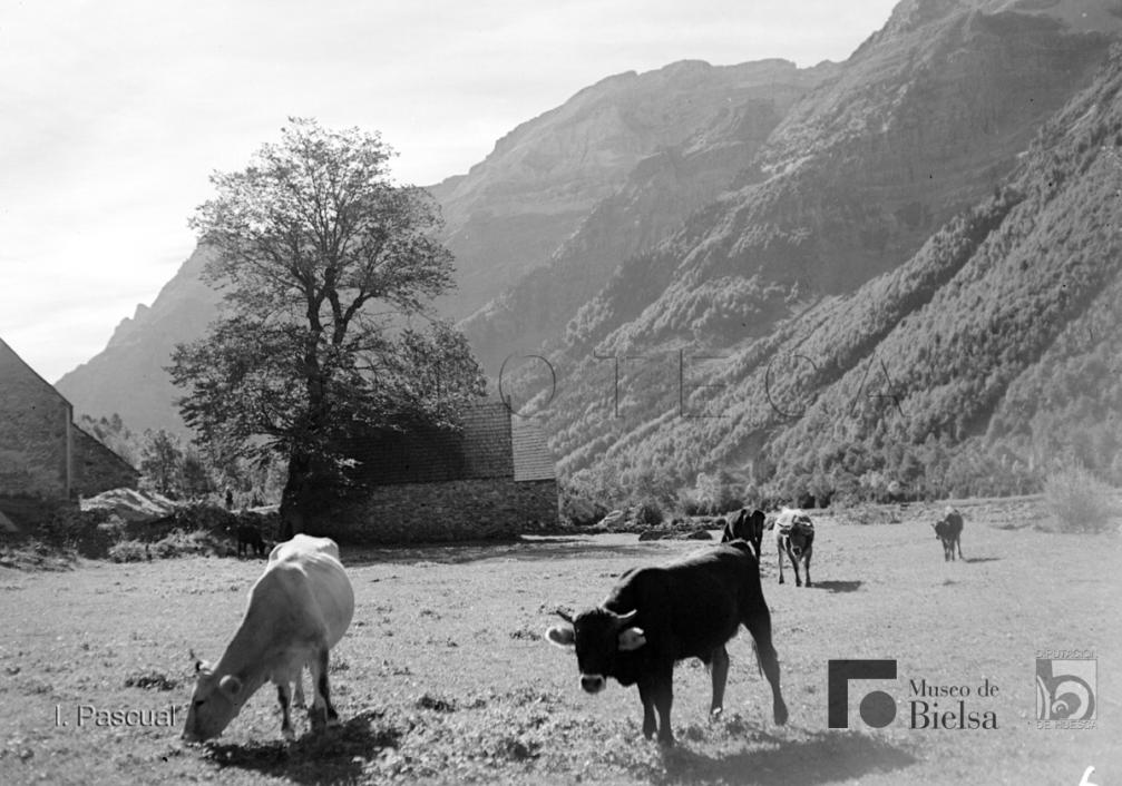 Contenido: Imágenes de Bielsa y del valle. Desde que conoció Bielsa a principios de la década de 1940, Ismael Pascual realiza fotografías de Bielsa y del valle donde se reflejan los cambios producidos por la reconstrucción del pueblo tras la guerra y por las obras hidráulicas en la cabecera del río Cinca. También realiza muchas salidas de alta montaña con un guía y en ocasiones con amigos y familiares. Bordas y ganado pastando en el valle de Pineta. |