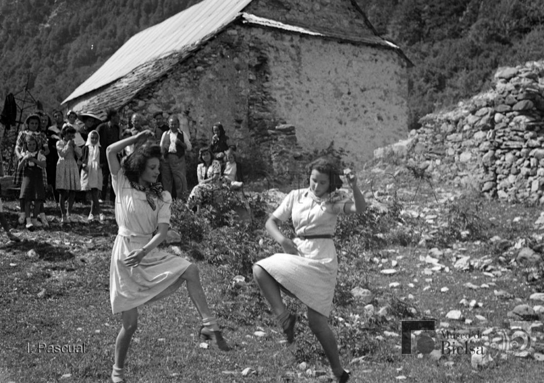 | Contenido: Bielsa. Fiesta en el valle junto a la ermita de la Virgen de Pineta. Bailando dos jóvenes de Bielsa, a la izquierda Pilar Méliz y a la derecha Manuela Sanz. |