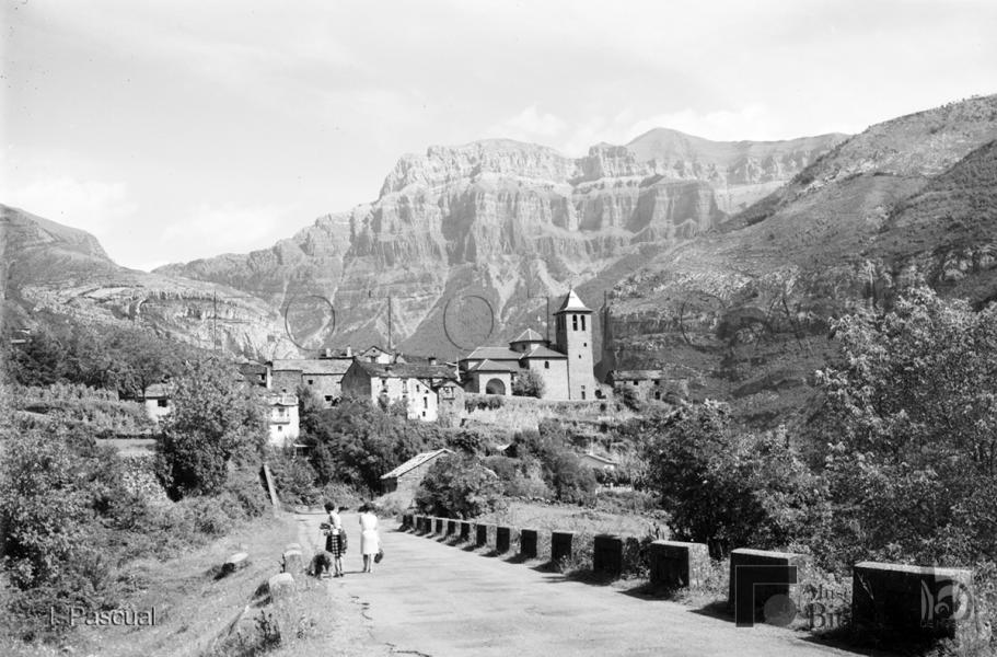 Contenido: Torla, vista parcial desde la carretera de acceso. Su primer destino en la provincia es Torla. Ya establecido en Huesca capital, sigue visitando el Pirineo en las décadas de 1950 y 60, dejando un material valioso para estudiar la evolución de los pueblos y paisajes. Torla y al fondo el Mondarruego. |