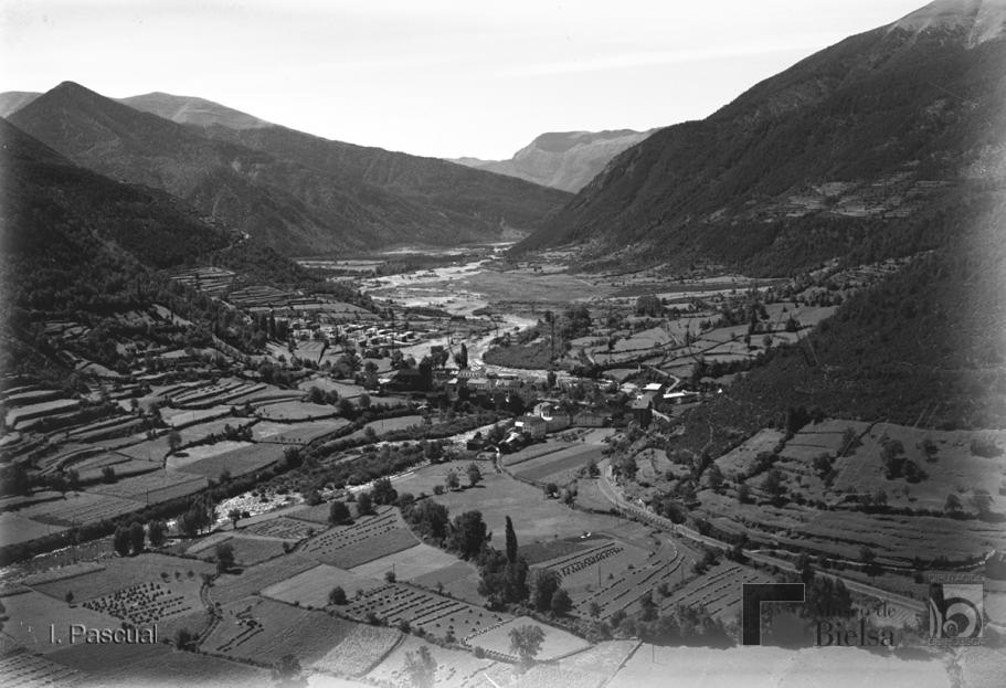 | Contenido: Su primer destino en la provincia es Torla. Ya establecido en Huesca capital, sigue visitando el Pirineo en las décadas de 1950 y 60, dejando un material valioso para estudiar la evolución de los pueblos y paisajes. Imagen de la población de Broto desde la carretera de Biescas. |