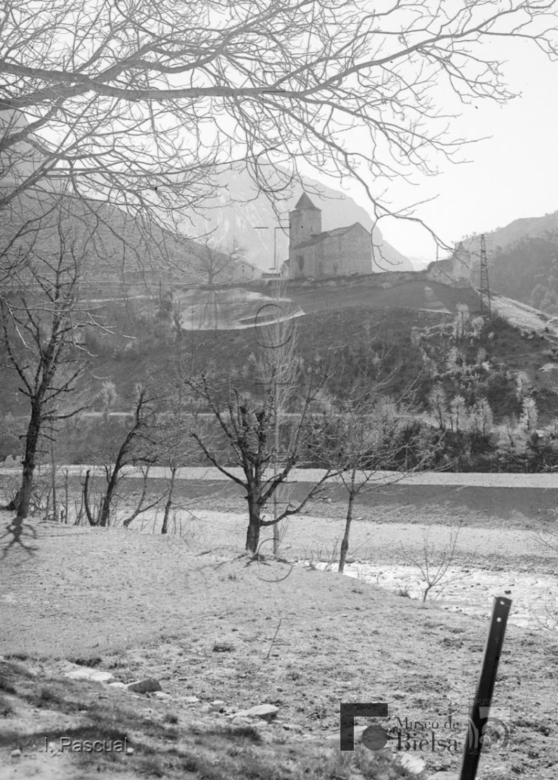 Contenido: Imágenes de Bielsa y del valle. Desde que conoció Bielsa a principios de la década de 1940, Ismael Pascual realiza fotografías de Bielsa y del valle donde se reflejan los cambios producidos por la reconstrucción del pueblo tras la guerra y por las obras hidráulicas en la cabecera del río Cinca. También realiza muchas salidas de alta montaña con un guía y en ocasiones con amigos y familiares. Salinas de Sin, en el cruce de los ríos Cinqueta y Cinca, sobre los prados, edificios construidos por la empresa Sociedad Hidroeléctrica Ibérica, explotadora del sistema hidroeléctrico del Cinca. Imagen de la iglesia de Badaín desde la carretera de Aínsa a Bielsa, en primer plano el río Cinca. |