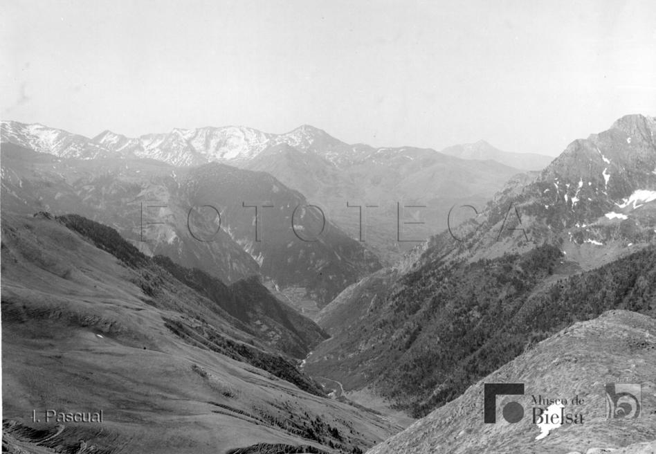 Contenido: Sus primeros destinos en la provincia fueron Torla y Bielsa, durante la década de los años 40 realiza un buen número de fotografías familiares, pero también de los pueblos, paisajes y gentes. Ya establecido en Huesca capital, sigue visitando el Pirineo en las décadas de 1950 y 60, dejando un material valioso para estudiar la evolución de los pueblos y paisajes del Pirineo. Valle de Chistau. Nota del autor a la imagen: ‘Camino de Viados hacia Claravide y Puerto de Gistain-Benasque’ |