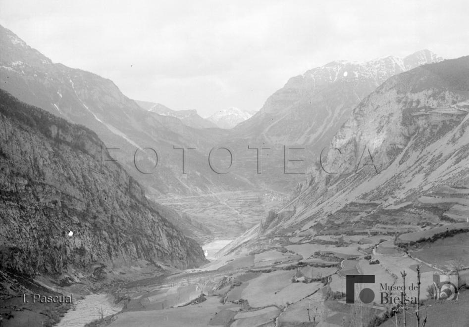 Contenido: Sus primeros destinos en la provincia fueron Torla y Bielsa, durante la década de los años 40 realiza un buen número de fotografías familiares, pero también de los pueblos, paisajes y gentes. Ya establecido en Huesca capital, sigue visitando el Pirineo en las décadas de 1950 y 60, dejando un material valioso para estudiar la evolución de los pueblos y paisajes del Pirineo. Valle de Chistau. Al fondo ‘La Comuna’, en primer plano el río Cinqueta. Nota del autor 'Panorámica de Sin-Señes’ |